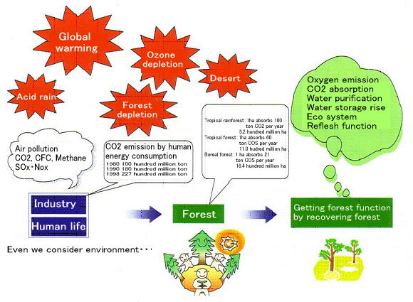 §3.Cause and conditionThe Earth temperature is determined by the balance between in and out energy. Current temperature increase is mainly due to lose the balance by increase of CO2.CO2 is discharged by igniting fossil fuels and has characteristic that absorb the heat from the earth, so that it is called greenhouse effect gas. There are other gasses which have same effects, such as methane, flon, and nitrous oxide. After 1980, average temperature in the earth has rapidly increased. There are several phenomenon such as heat wave and drought occurred due to global warming. Because of increase the temperature of ocean water, the level of ocean rose up. As a result salt water goes into underground water and rivers. The decrease of rain water causes desertification so that the agriculture is destroyed in the world. Global warming causes the lack of food in the world seriously. he factors of destroying ozone layer are artificial chemical substances such as flon and halon which had been used in refrigerator and sprays. When these matters rise up, chlorine atoms are produced by reaction with strong ultraviolet rays. Chlorine atoms take oxygen atoms from ozone, and a ten thousand ozone are destroyed by the one atom. Ozone exists at a height of 20 km and makes ozone layer. Ozone absorbs ultraviolet rays from the Sun. Ultraviolet rays causes skin cancer, cataract, and genetic defect. Ozone layer which absorbs ultraviolet rays has been destroyed. The factor of deforestation is the uncontrolled use of the area to industrial tree felling and agriculture. Igniting fossil fuels produces nitrogen oxide and sulphur oxide and these substances are changed nitrate ion and sulphate ion which leads acid rain. Acid rain destroys forests. Deforestation causes not only the extermination of living things but also decrease CO2 absorption, thus speeding up global warming. Tropical forest destruction also speed up. If it lasts this situation, it reports that all tropical forests will be destructed by 2030. In the mid of 1980, there are 19 hundred million ha tropical forest. In every year, 1420 ten thousands ha are cut and changed to agricultural fields every year. Forestation is only 1 hundred thousands, and it is just 1/10 of decrease area. The factors of desertification are excessive farming, overgrazing, and overcutting. On the background, there is population growth. To obtain enough food resource, lands are used endlessly thus desertification occurred. That causes more lack of food so that leads negative cycle. Every year, 600 ha desertify. There are also 21 million ha agricultural area decreases its productive ability. The agricultural productive ability decreases in the area where desertification progresses. Thus, there is serious issue of starvation and lack of nutrient.