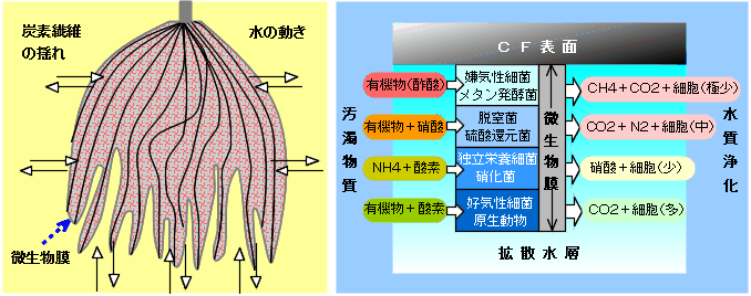 もつ炭素繊維が、水中で揺れながらネットポンプ運動といわれる変形−回復の運動を繰り返すことで、微生物膜内の物質移動はより