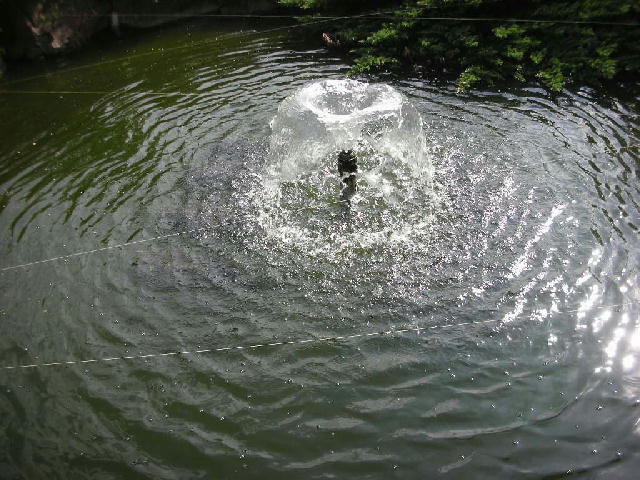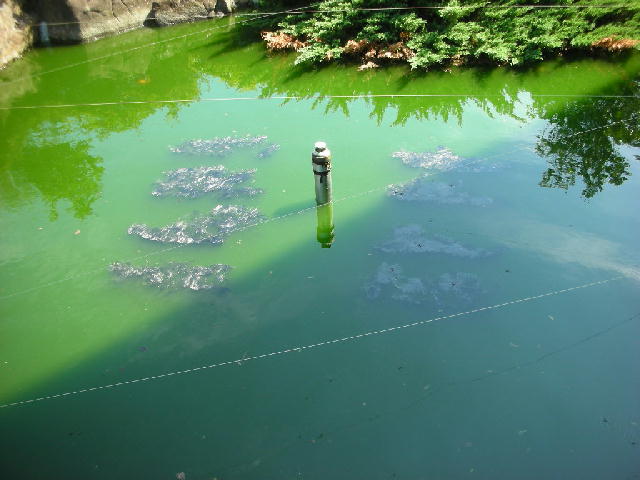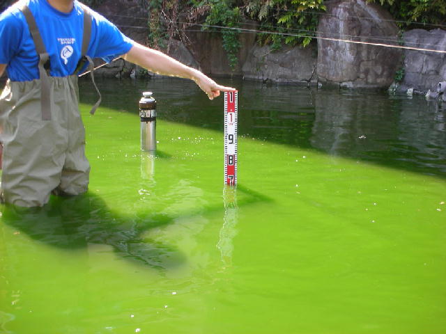 “鎌倉市武道館「池」水質浄化作戦”鎌倉市武道館について鎌倉市武道館は、下水終末処理場である山崎水質浄化センターに併設された、古都鎌倉にふさわしい重厚な武道館です。 池の色は、アオコにより黄緑色、透明度はなく魚類の姿は見えません。噴水による曝気をしていますが、緑色の水を噴き上げている感じです。 2008年8月8日 水質測定パックテスト、透視度計による簡易テストを行いました。 ●測定項目 ・透視度、・COD、・PH、・硝酸(窒素)