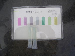 水中に素手を入れると痒くなるような、かなりの汚染度に炭素繊維にての水質浄化が可能かどうかは心配ですが様子を見ることにしました。 2008年10月7日 炭素繊維設置後の状況観察設置後2ヶ月の水質浄化効果の観察を、目視及び水質測定にて行いました。 ●水質測定項目 ・透視度、・COD、・PH、・硝酸(窒素)