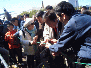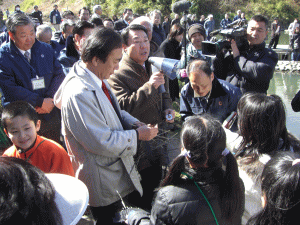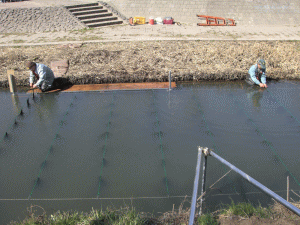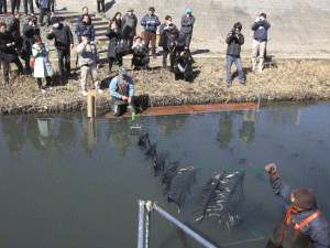 炭素繊維水質浄化装置の設置埼玉県の上田知事らも組立に加わり、完成した炭素繊維水質浄化装置をみんなで設置しました。