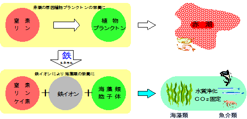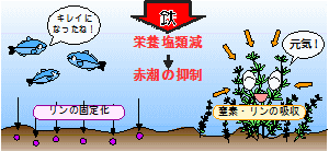 藻場再生プロジェクト海藻類が成長するには、肥料となる栄養素、窒素やリン、ケイ素などが必要です。汚染された海水には窒素やリンが大量に含まれているから栄養豊富と思いがちですが、海水中にある窒素は硝酸塩NO3−、リンはリン酸塩PO4− という形で溶けていて、このままでは海藻類の養分になりません。養分となるためには、還元して窒素NとリンP の形に戻してやる必要があります。還元とは、酸化の反対で酸素Oを取り除くことで、その働きをするのが金属イ オンの鉄Fe+ なのです。 鉄は、地球全体の35%、地殻物質でもその約5%を占める主成分で、地表や生物体内などにおいて、その酸化還元 環境の変化に対応して比較的容易に酸化数を2から3に変えることのできる元素です。それゆえ、有機物の生成や分 解に際し、極めて重要な働きをします。ところが、特に3価の鉄は、水に溶けにくいため、陸ではそれほど問題にな りませんが、(酸性にしたり、有機物と共存すると溶けるので、陸の生物にとっては、溶けすぎが問題になる)、海 では鉄不足が問題になります。 この生物にとって必須鉄分を、海藻類が吸収し易い形にしていたのが、森林に堆積する腐葉土が作り出す「フルボ酸」です。 フルボ酸は、地中の鉄を溶かし海へと運び、海藻類はミネラルとして鉄分を吸収できたのです。このフルボ酸鉄が、 森林から供給されなくなって、海は鉄不足となり磯焼けが進行しました。 ![]() この溶けずらい鉄を溶かし、鉄イオンとするために、ミラカーボンが大きな働きをします。ミラカーボンはほとんど 炭素からできた物質であり、炭素は鉄などの金属と比べ電気陰性度が高く、接触させると電気陰性度の低い鉄より鉄 イオンを溶出させることができます。 ミラカーボンを鉄材と一緒に、海中に設置すれば、鉄イオンが溶け出します。鉄イオンは、ミラコンブに着床した海 藻類に吸収され、成長を促進させます。 さらに鉄イオンは、水中のリン酸塩そのものとも化学的結合を行い、リン酸鉄として固定化され赤潮などの原因となる 植物プランクトンを増殖させません。また、鉄イオンは動物性プランクトへも好影響を与え、アワビや牡蠣などの必須 ミネラルとして機能します。 ![]() |