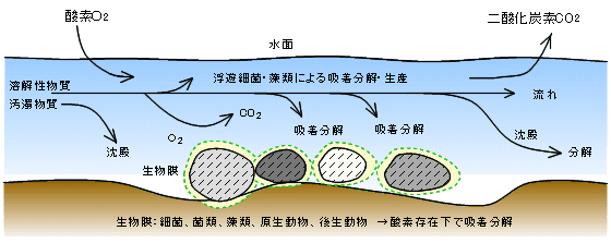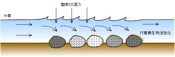 河川においては、河床上の礫や岩等の表面に付着成長した生物膜に、河川水中の有機物あるいは無機物が沈殿・吸着されます。有機物は生物膜を構成する生物群によって酸化・分解されます。