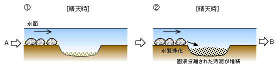 河川の浄化作用により、酸化、吸収、吸着された物質は固形化し、流速によって剥離あるいは沈殿汚泥として河床に堆積します。この堆積した汚泥は、出水時に流速が非常に速くなると掃流され、河川の浄化機能が回復します。