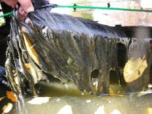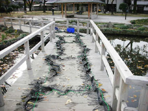 橋脚に張ったロープに炭素繊維浄化材を吊下げる。